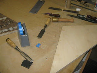 I decided to use my Japanese knife and make a score line which would break the veneer and prevent even further brake out. I wasn't really getting any break out from the chisel since I had paints tape on the other side which would cushion the break.