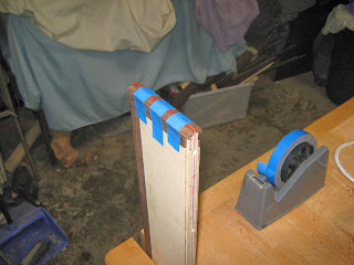 Glued the inlay pieces into the rebates with tight bond 3 glue. This will need to stay in the clamps for 2 hours. I used painters tape to mask sections where I did not want glue to go onto and used pressure cauls to prevent clamp damage to the panels.